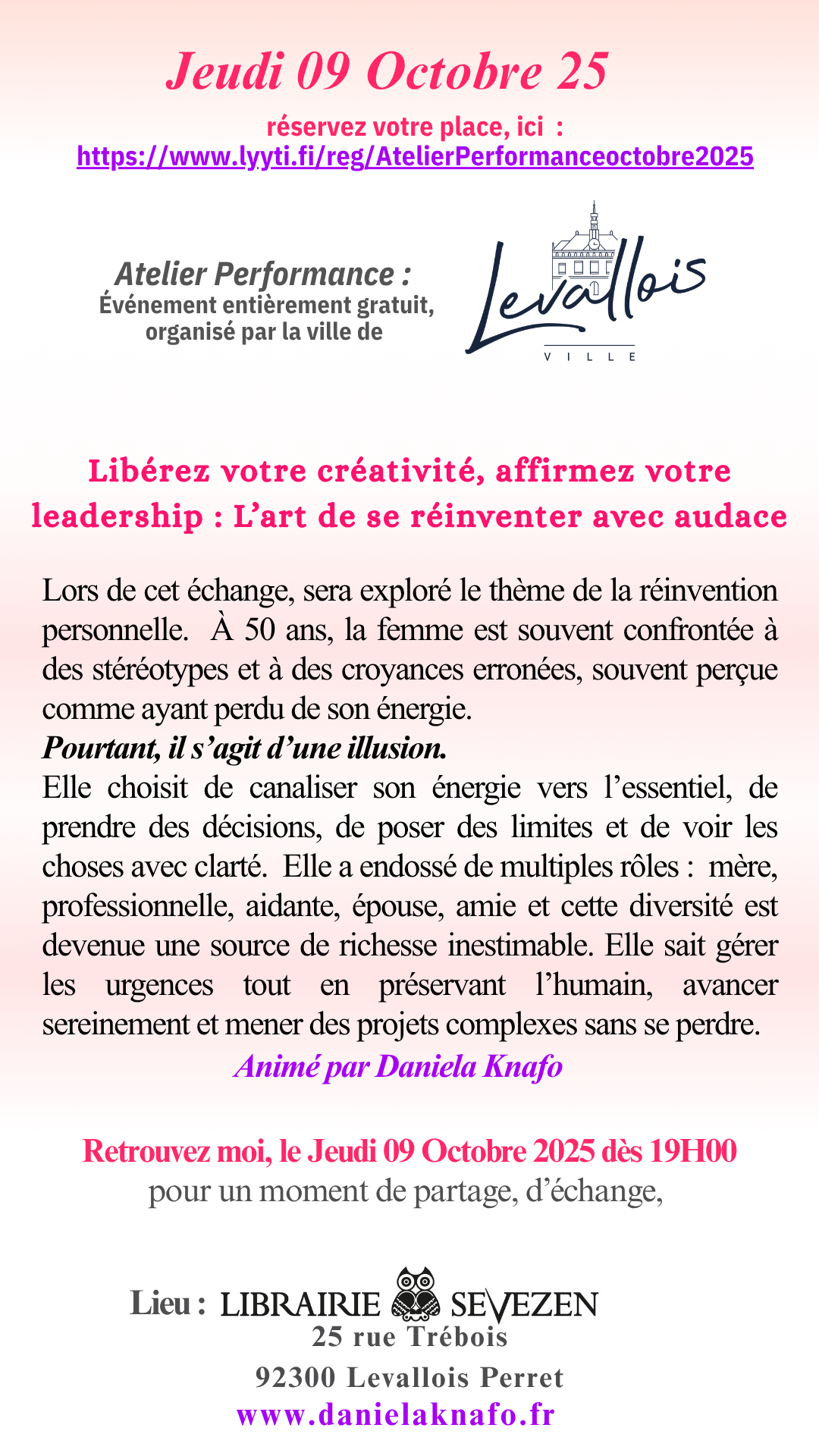 L’Atelier Performance sera suivi d’un cocktail, avec la possibilité de gagner l’un des deux exemplaires dédicacés par l’auteure.